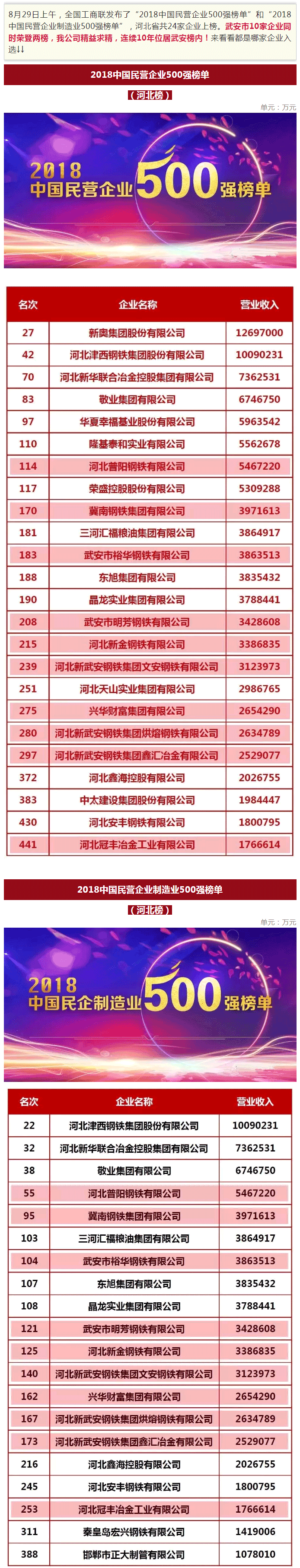 鑫匯公司榮登中國民營企業(yè)500強(qiáng),武安市10家企業(yè)榮登兩榜