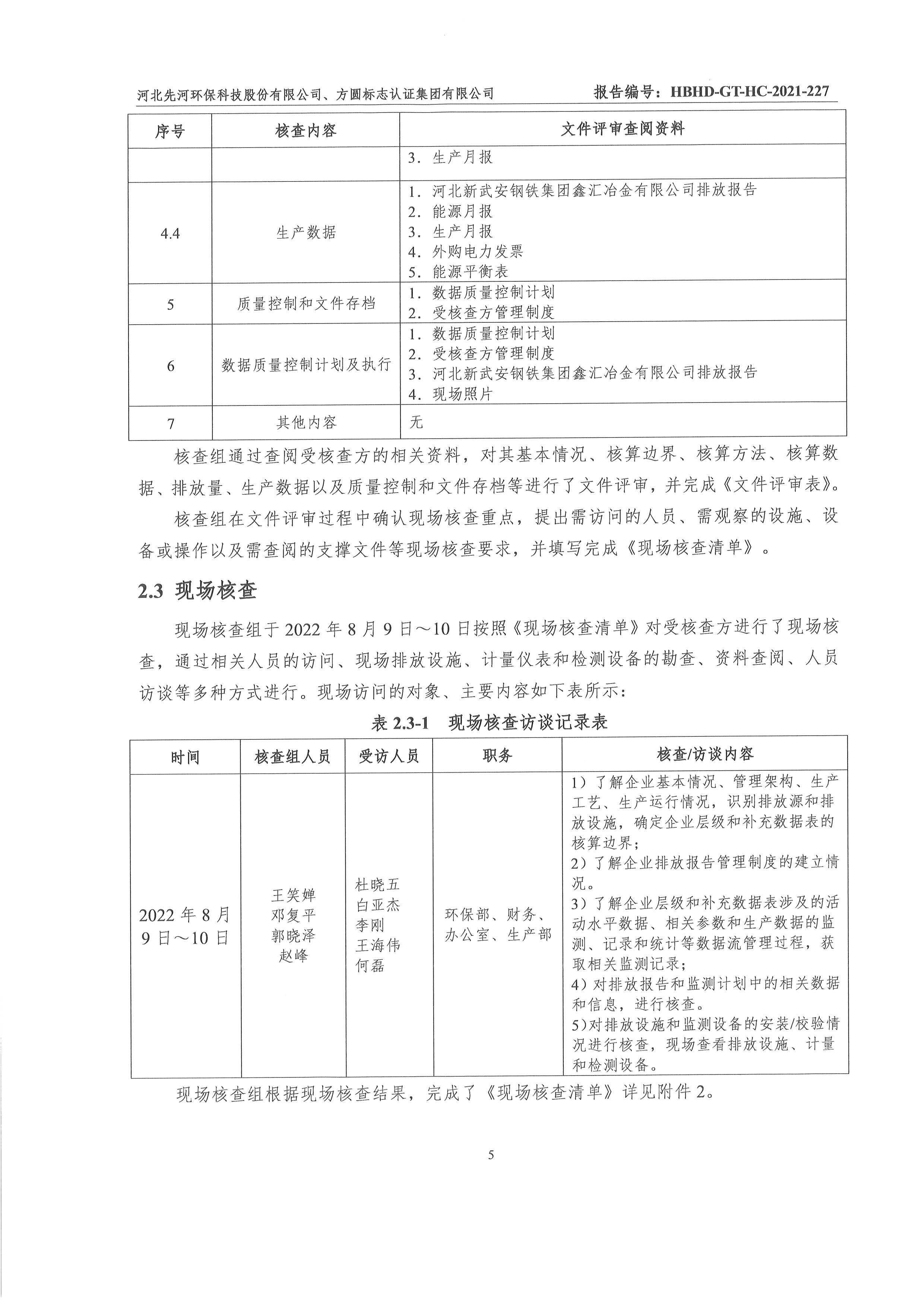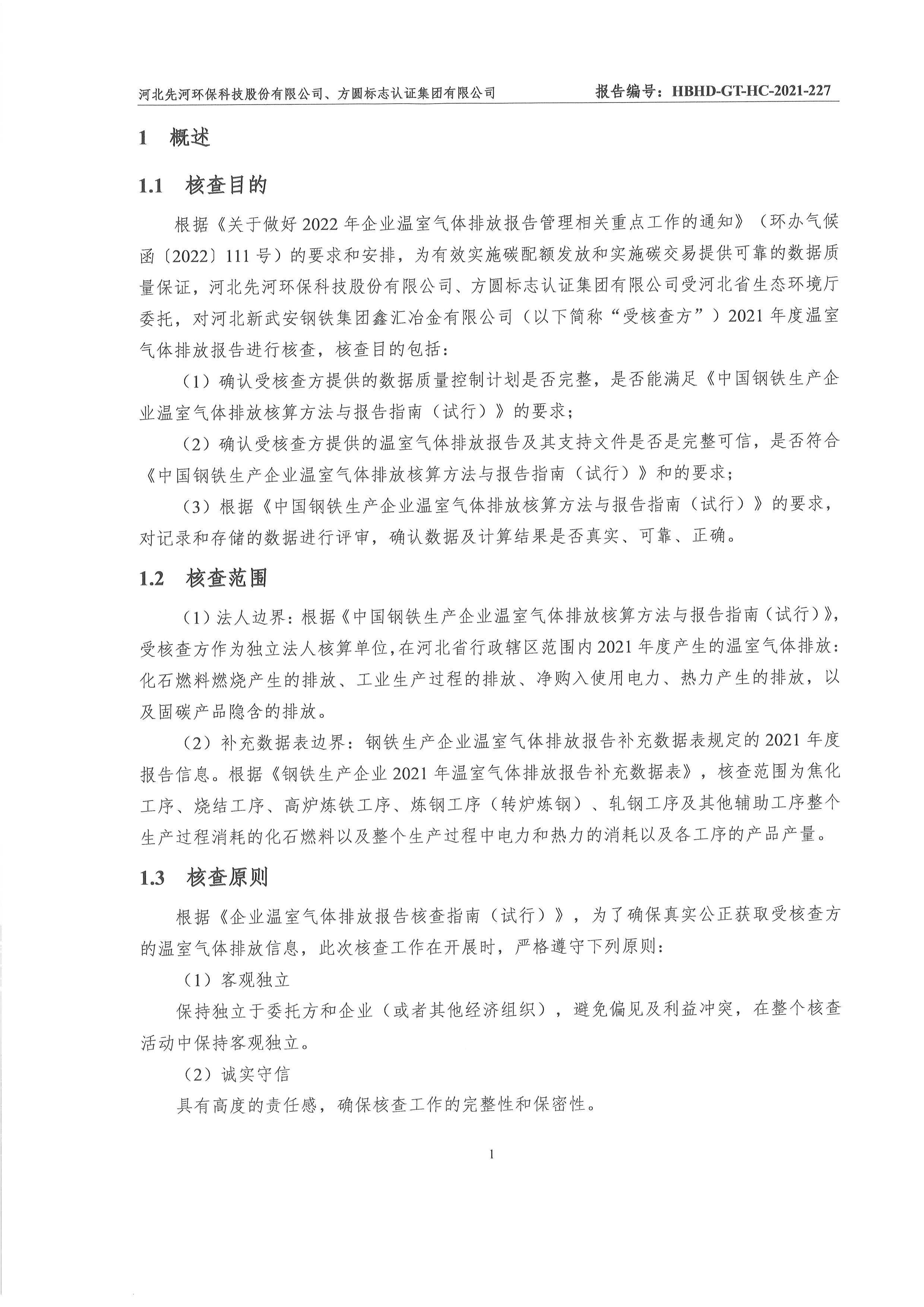 2021年河北新武安鋼鐵集團鑫匯冶金有限公司碳排放核查報告